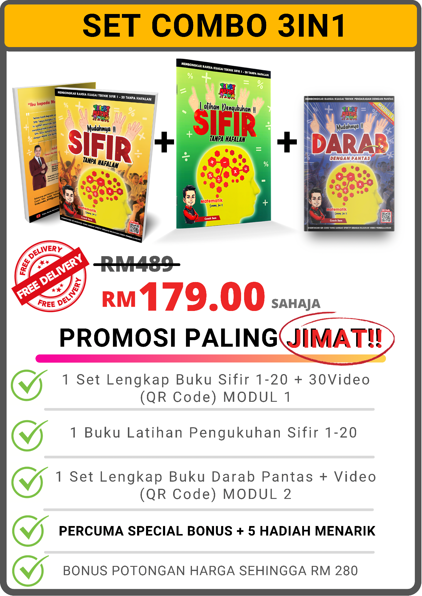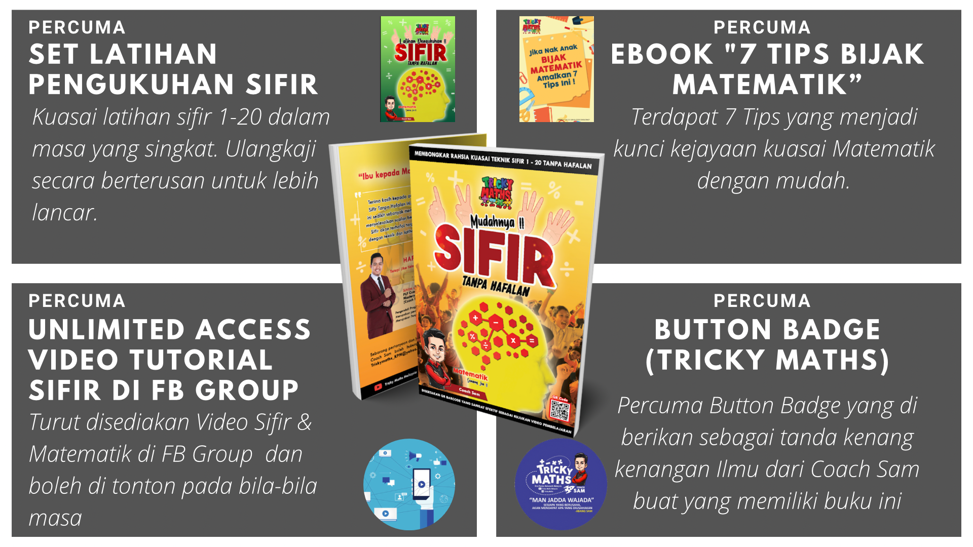 Telah didedahkan di dalam buku ini bagi Teknik Sifir 1-20 yang disertakan Video teknik pembelajaran untuk anak anda kuasai sifir.
